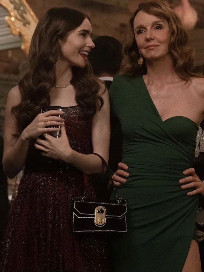 在家宴中emily身穿vivienne westwood经典红色格纹西装内搭复古宫廷褶皱领衬衫,复古法式style呼之欲出,再加上一双christian louboutin的绿色高跟鞋,以致让camille17岁的弟弟“阴差阳错”地对emily一见钟情。