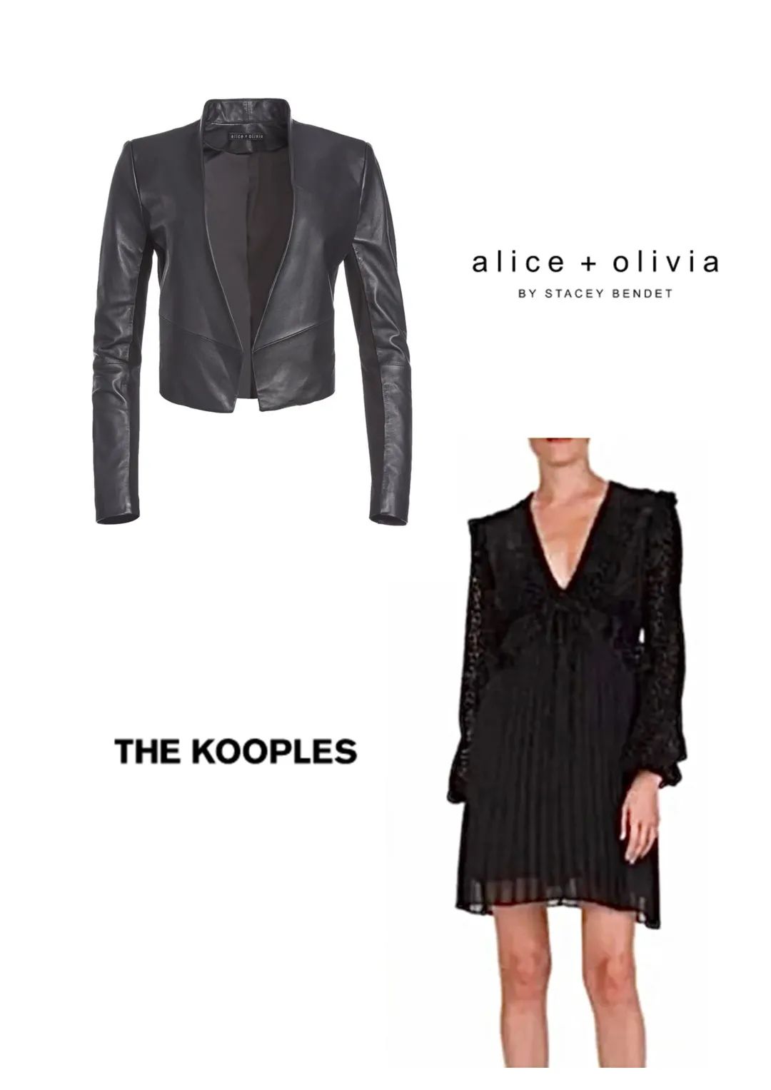 当天她穿了最不容易出错的all black。alice+olivia的皮夹克搭配the kooples的黑色v领连衣裙,胸前以chanel三层珍珠项链点缀,又酷又chic。