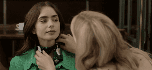 活动散场之后,emily碰见了在法国土生土长的女孩camille,她看到了emily脖子上的丝巾后,不由得帮着emily调整了下丝巾的角度——将放在后面的丝巾系结移至正面一点,在大衣里稍露出一角,让emily学到纯正的法式精髓。