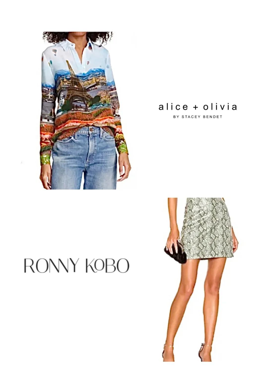 第二天前去公司报到,emily特意选择了印有巴黎印花的alice+olivia衬衫表示自己想要融入当地文化,搭配ronny kobo的兽皮花纹包臀裙在身,颇有一番无所畏惧、自信大胆的韵味。