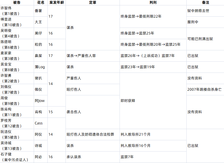 秀茂坪童党烧尸案参与者所受刑罚一览