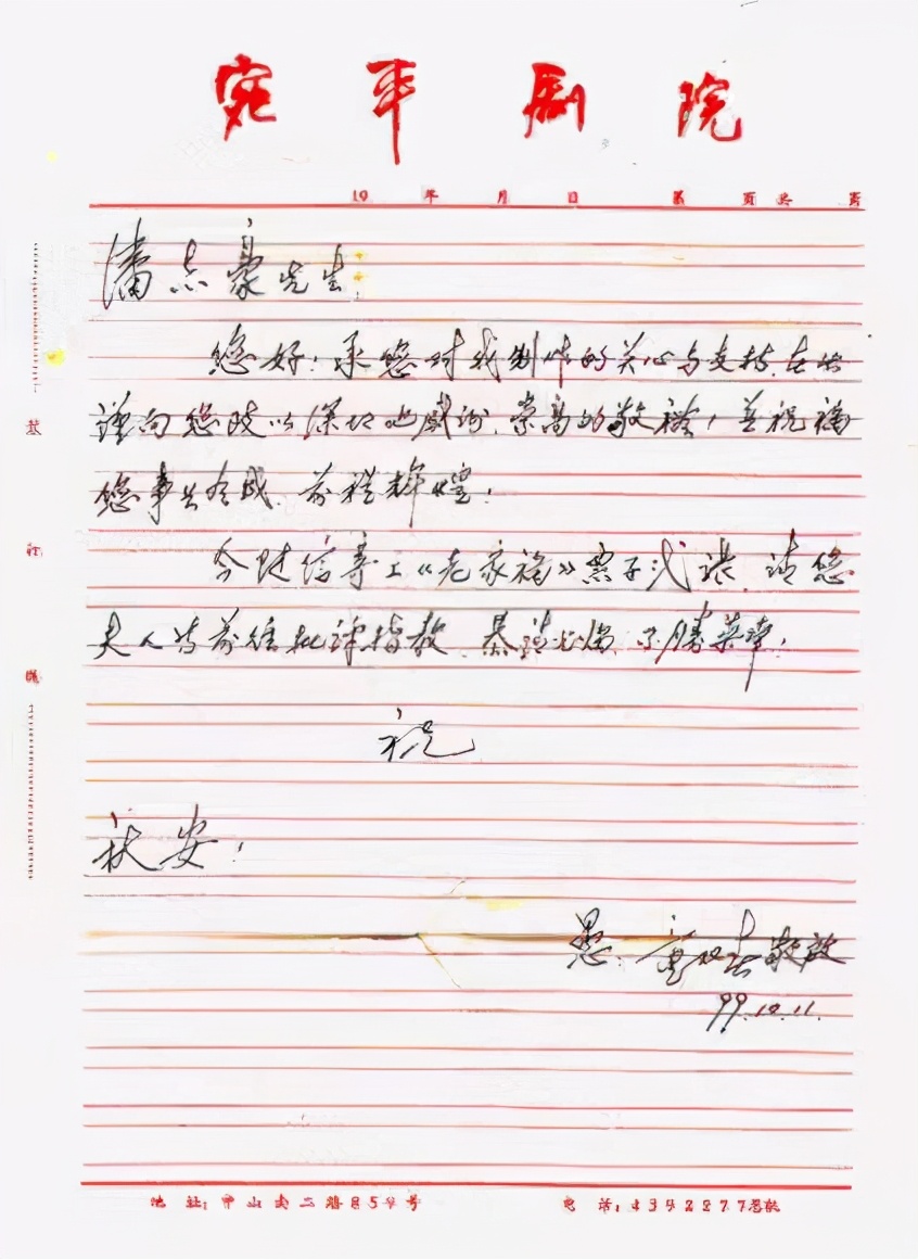 潘志豪先生:您好!承您对我制作的关心与支持,在此谨向您致以深切的感谢、崇高的敬礼!并祝福您事业有成,前程辉煌! 今随信寄上《老家福》票子二张,请您夫人等前往批评指教。恭请光临,不胜荣幸! 祝 秋安! 愚:童双春敬启99.10.11