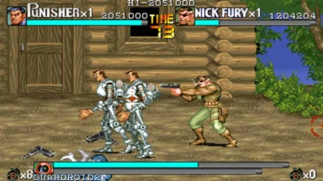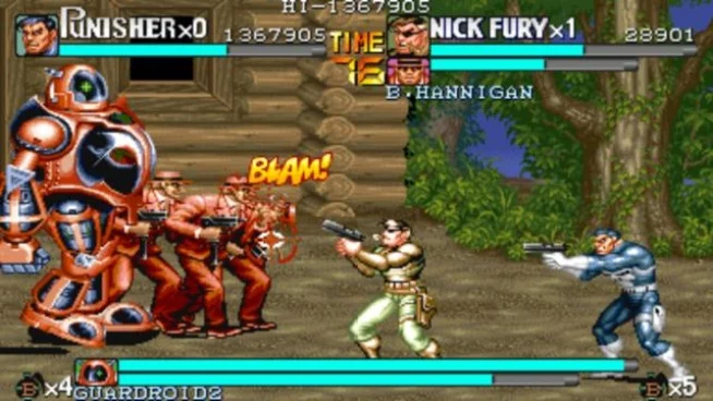 "?第二关boss是叫guardroid1机器人,上来就杀了bruno,它是毁灭博士doom的城堡中的护卫机器人,被金并盗走对付惩罚者,它会用拳头锤击和腿踢还会发击光。第二关讲的是惩罚者通过水路进入了bruno的住所,一路追杀,最终找到了bruno,但bruno却被金并的机器人guardroid1干掉了,惩罚者和尼克打烂guardroid1之后知道了他们的来头,后一路杀过去,顺便打击金并的犯罪事业。