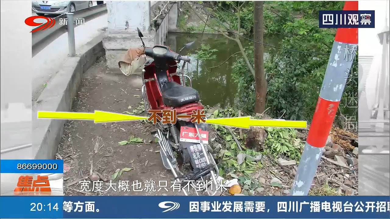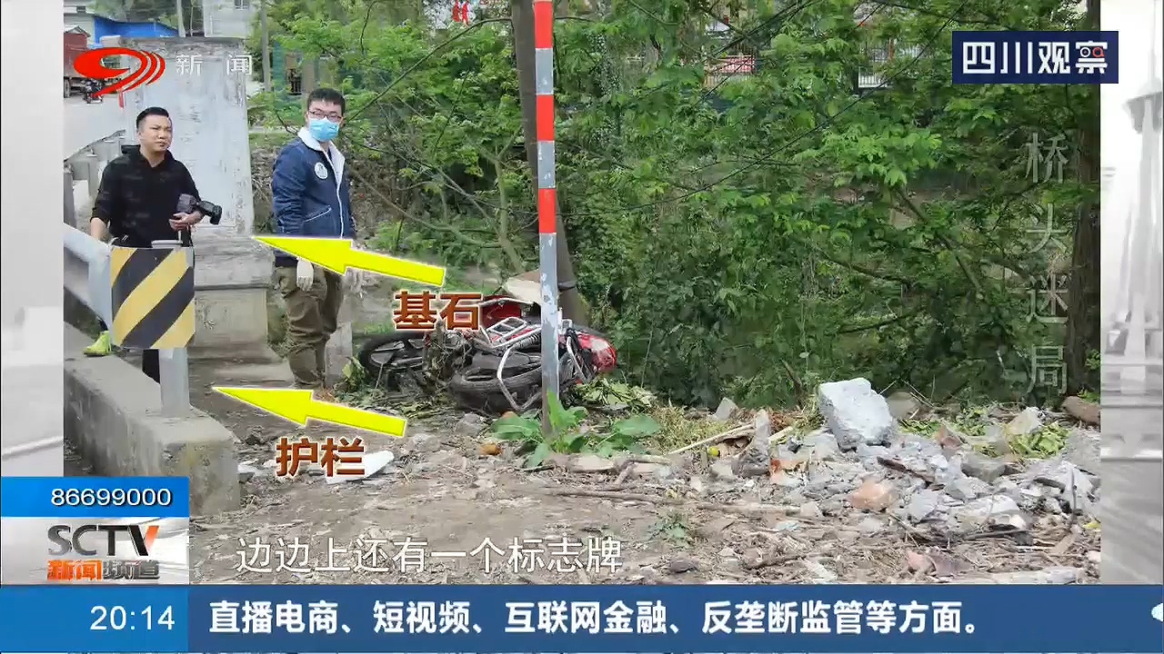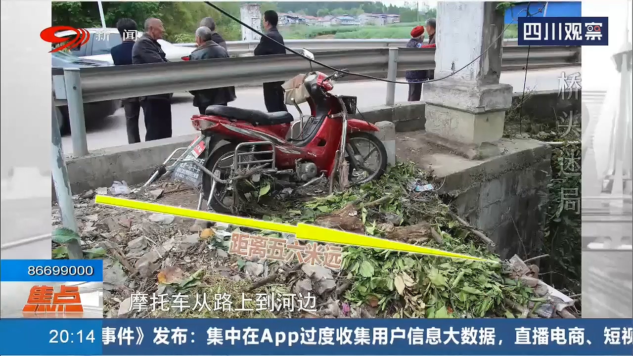 桥头处通往河床的斜坡上,散落着不少车身残片。很可能就是摩托车坠河的地方。