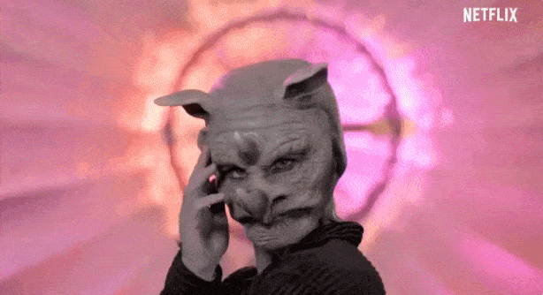 不过节目组这一玩就把 blind date 的玩出了新境界,头套直接改成戏剧性的「非人」面具,于是就出现了下面这些场景....