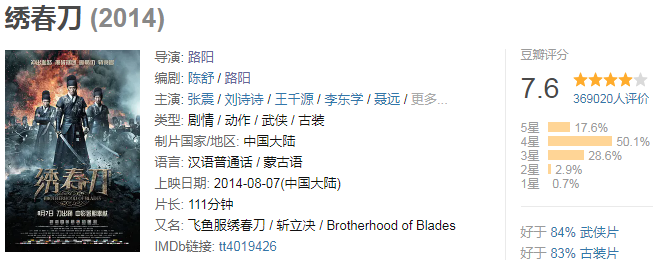 这一成绩好于84%的武侠片,足以证明路阳驾驭故事的功底。