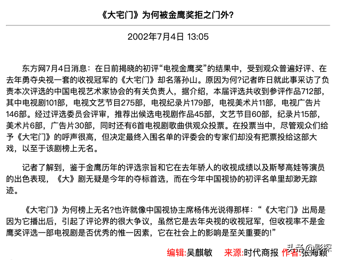 名导谢飞更是称《大宅门》是中国电视剧的顶峰之作。
