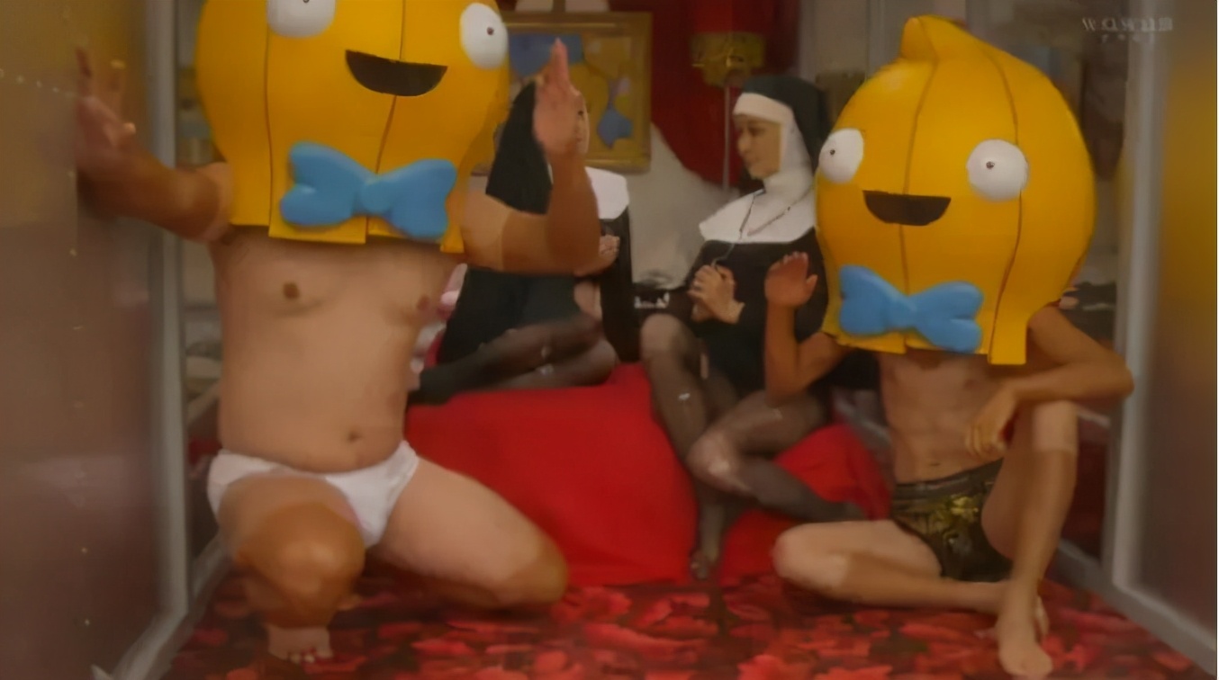 《马赛克日本》中两位男优扮演花生,正与扮演修女的女优拍av。