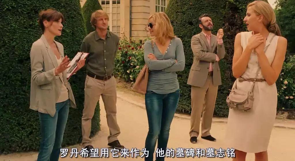 他们去罗丹博物馆逛,保罗(右二)就开始逼叨。讲解员都怕他。扮演讲解员的(左一),是气质婉好的前法国第一夫人卡拉·布吕尼。