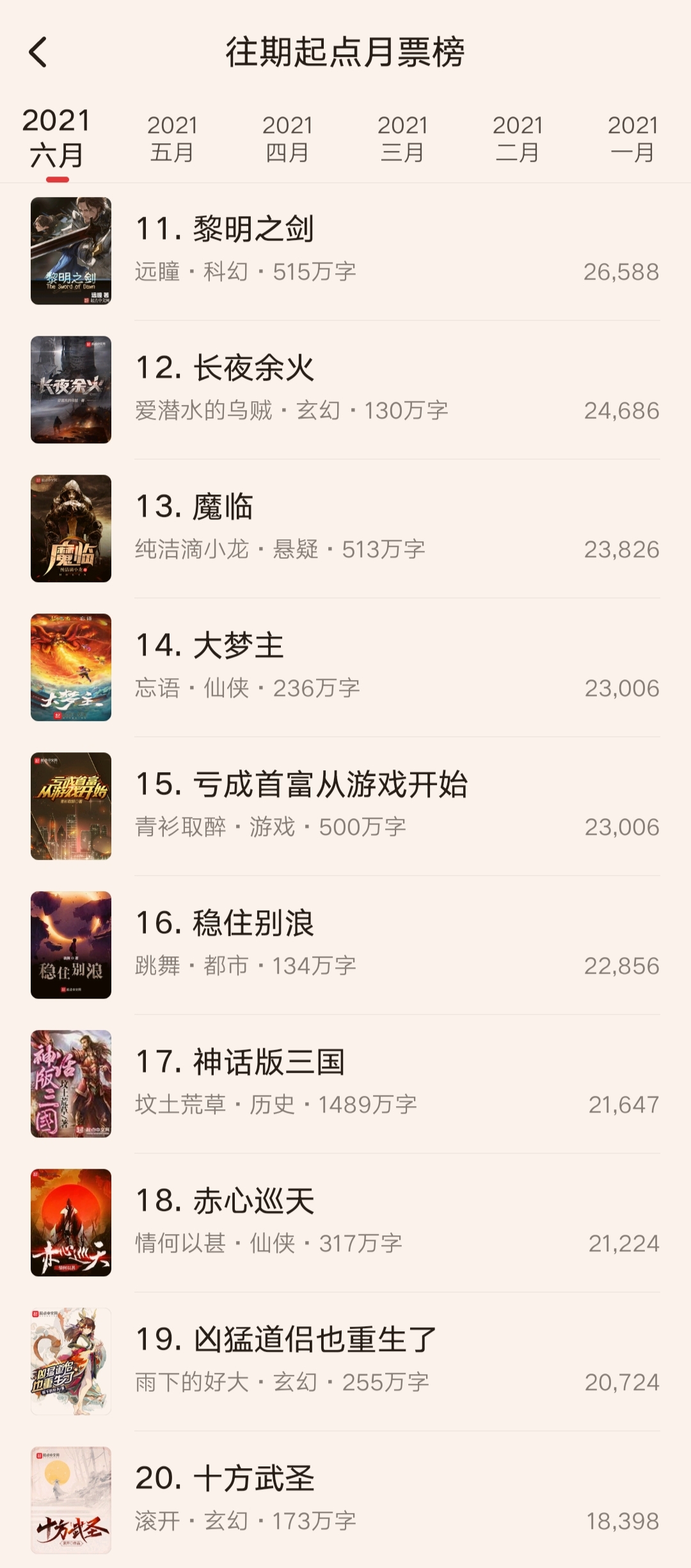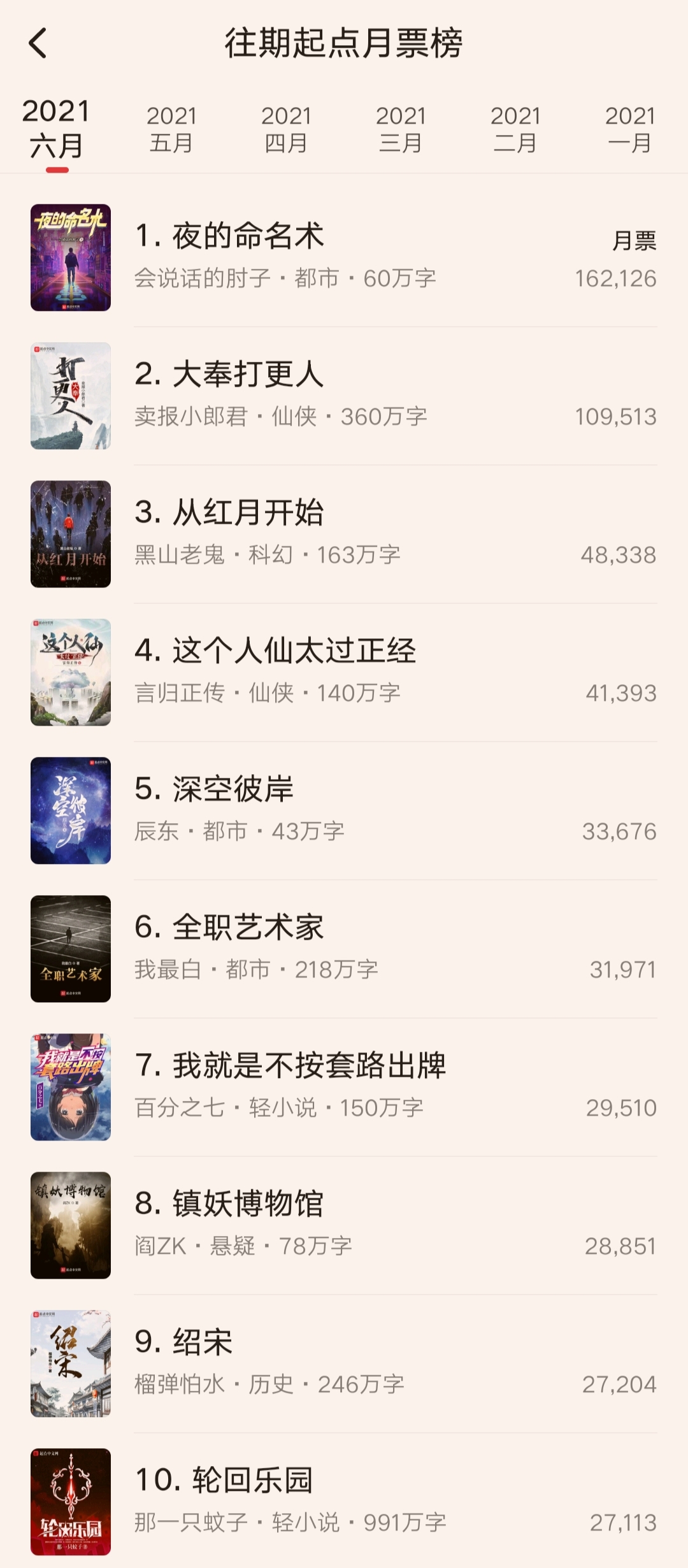 六月份的起点月票榜排名还是挺出人意料的,前十名出现了不少新面孔。
