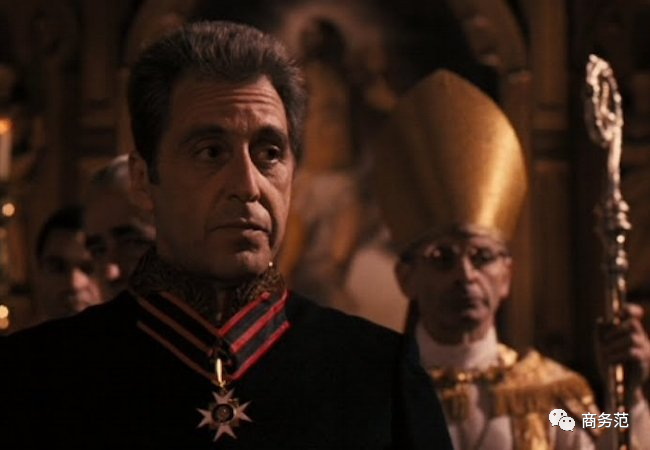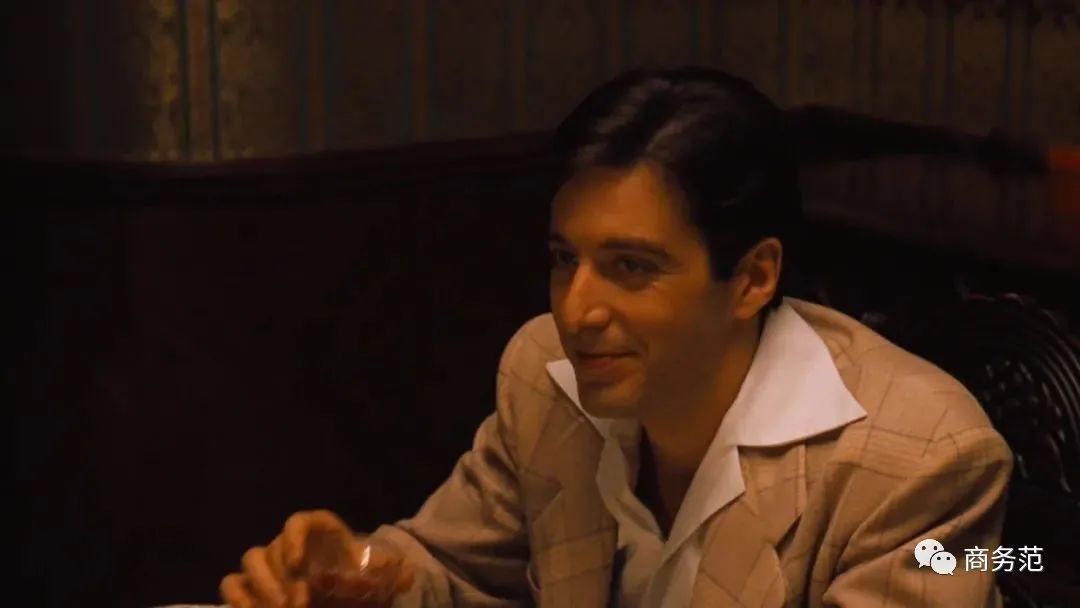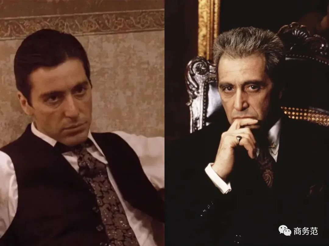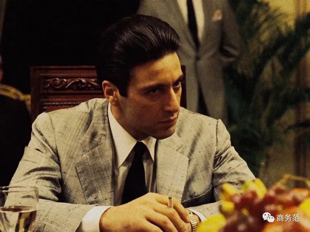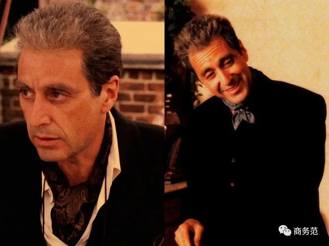 后来接班迈克尔成为第三代教父,油头黑西装等“教父标配”也跟着安排了起来。