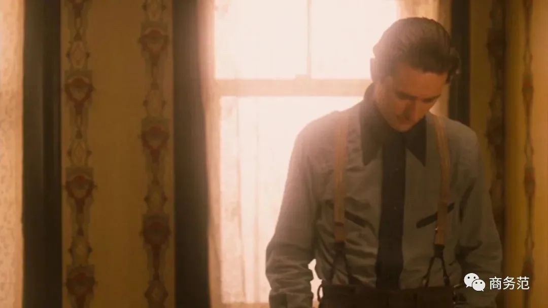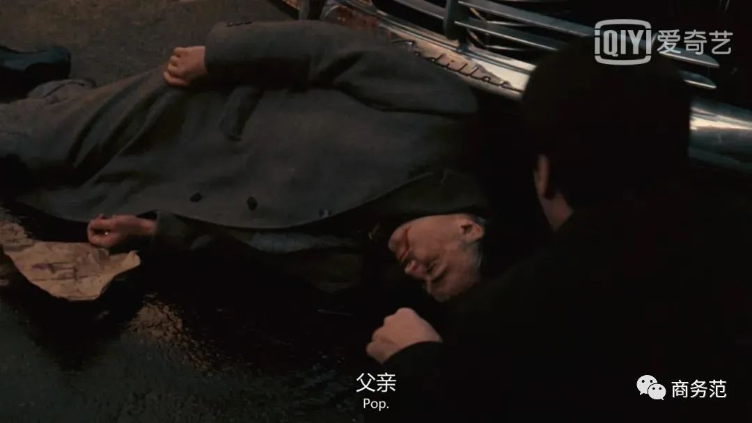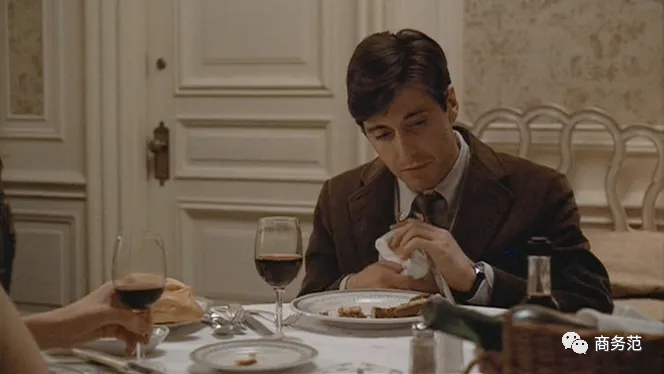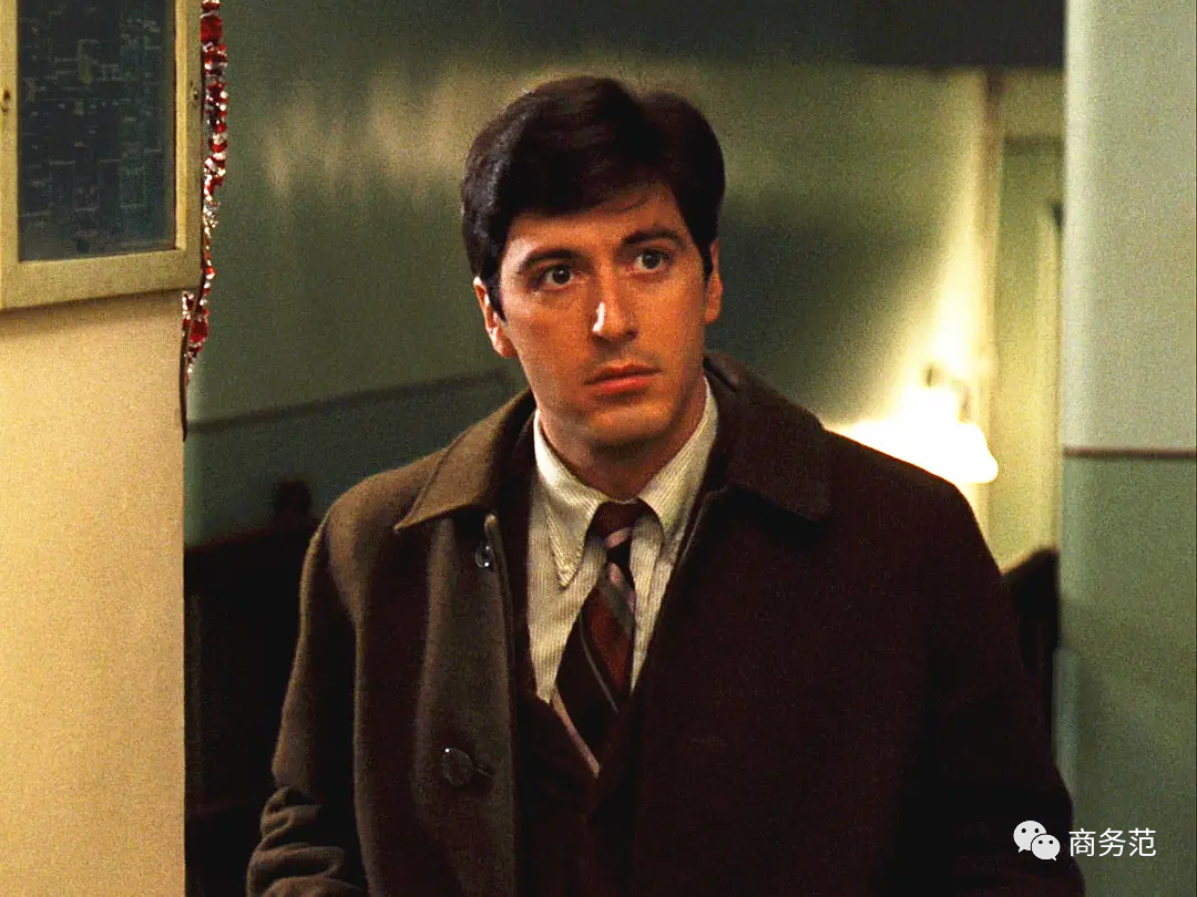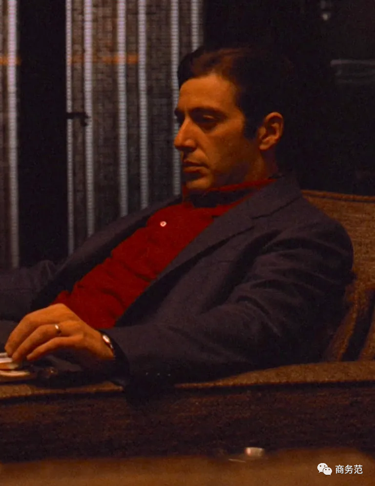 然而父亲遭遇仇人枪击受伤,为父报仇的局上,迈克尔正式穿上了和父亲以及家族其他成员一样的西装三件套,预示着二代教父的时代来临,凶狠的眼神写满了“黑化”和城府↓