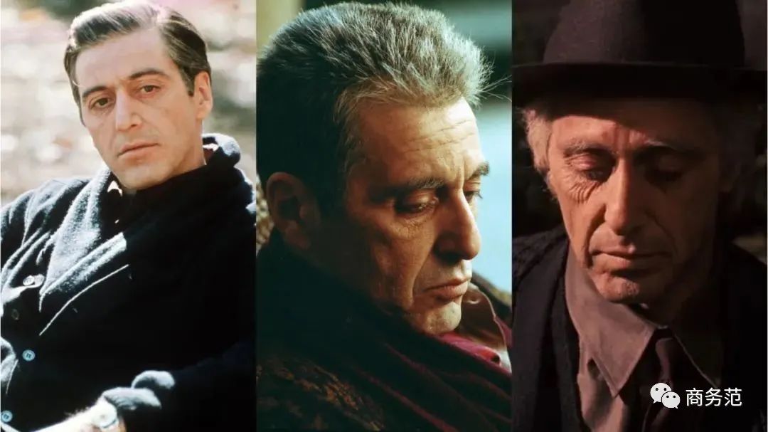 二代教父由老牌巨星阿尔·帕西诺饰演,出演第一部时他也是初出茅庐,只演过两部电影。帕西诺在电影中的造型跨度从青年一直到老年,称神的演技把迈克尔这个角色塑造成了经典↓
