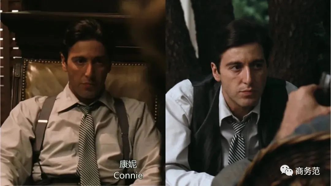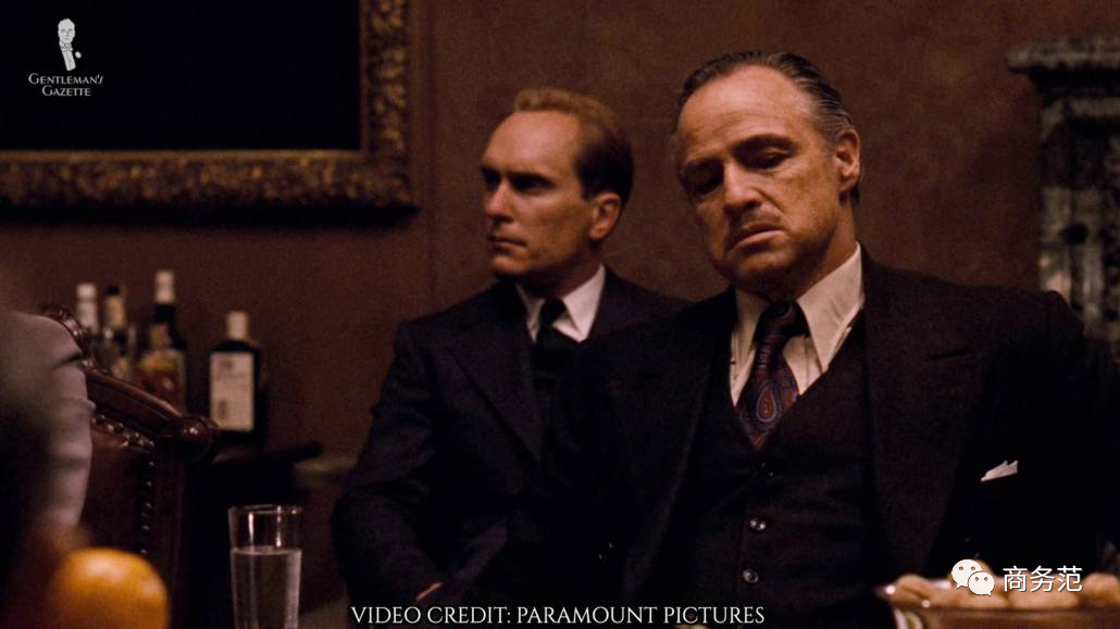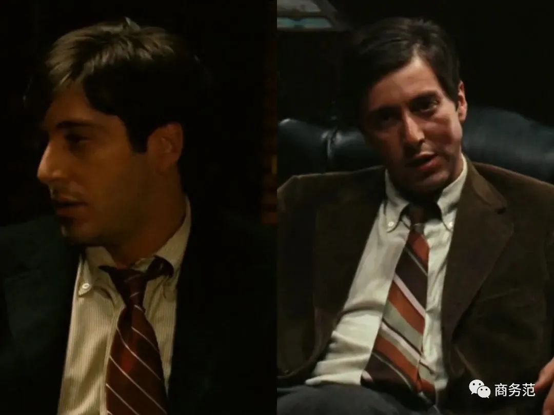 老教父的日常穿衣也很有看点。在出席黑帮会议和各路大佬谈判时,会选择西装三件套,严肃的黑色西装搭配一条提花领带,同样是气势十足,不怒自威。