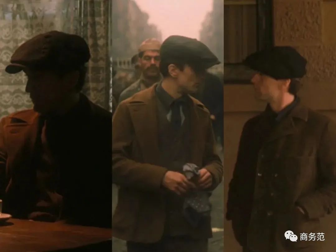 外套基本上是这种看上去比较粗糙厚重的棕色毛呢材质短款西装,或是双排扣西装夹克,质感不怎么好,也比较符合他穷人的身份。每次干坏事时,都要戴着一顶黑色鸭舌帽,堪称“工作服”↓