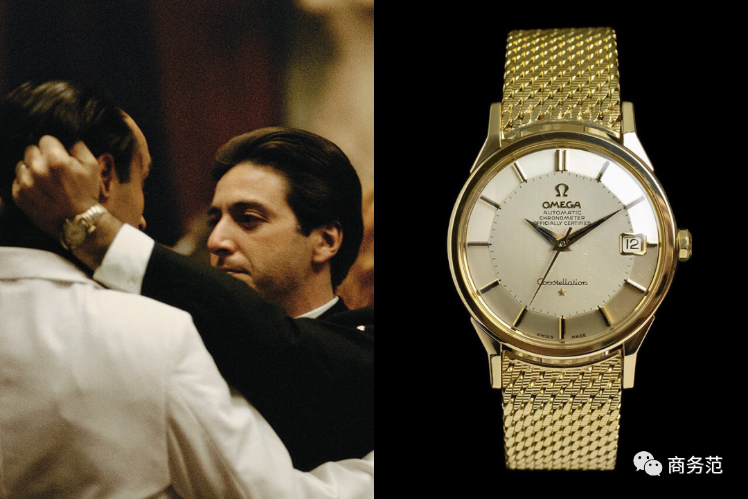 到了第二部成为大佬后,马上换成了大金表,比如这块14k金欧米茄星座系列馅饼盘(已停产),现在的腕表市场上价格还要9500美元。