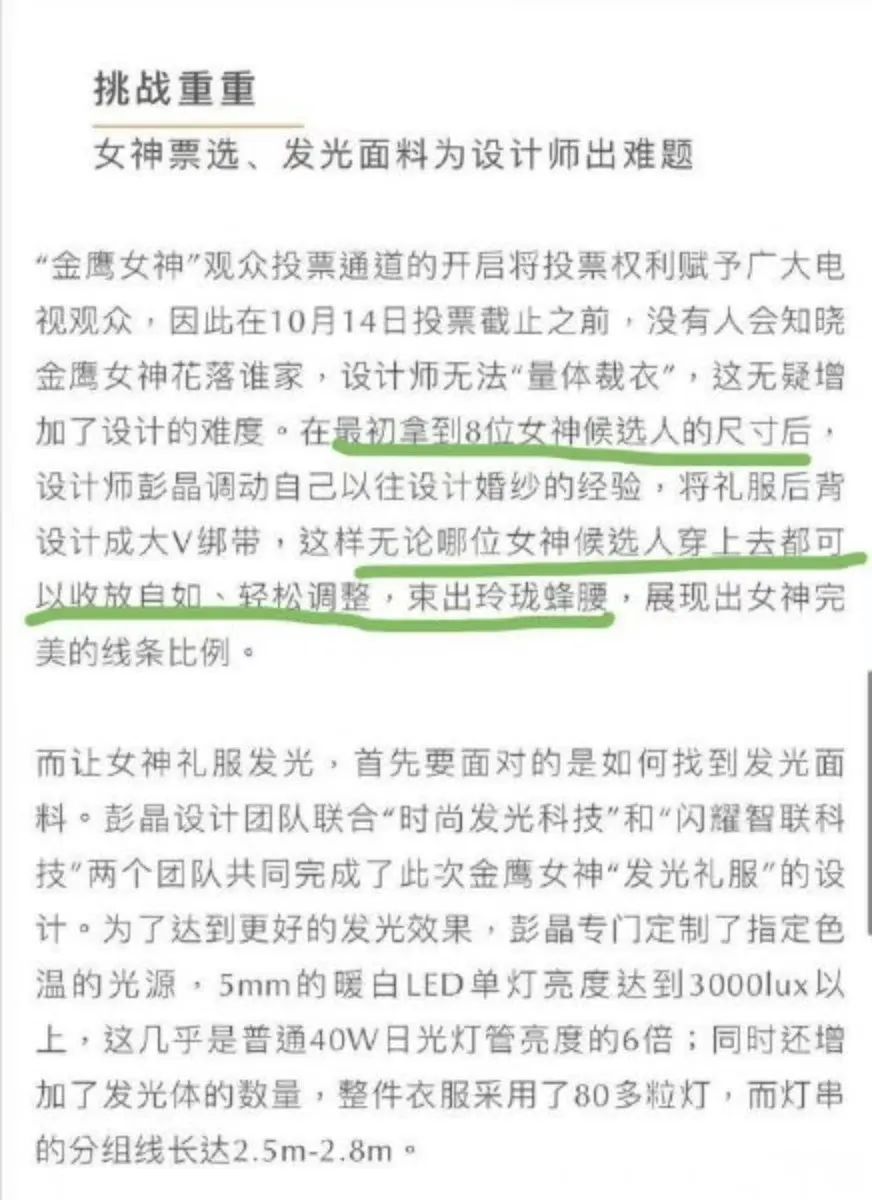 金鹰节十月开始,制作金鹰女神礼服的设计师说她设计的裙子是均码,八个候选人谁都能穿,且收放自如,束出玲珑蜂腰。