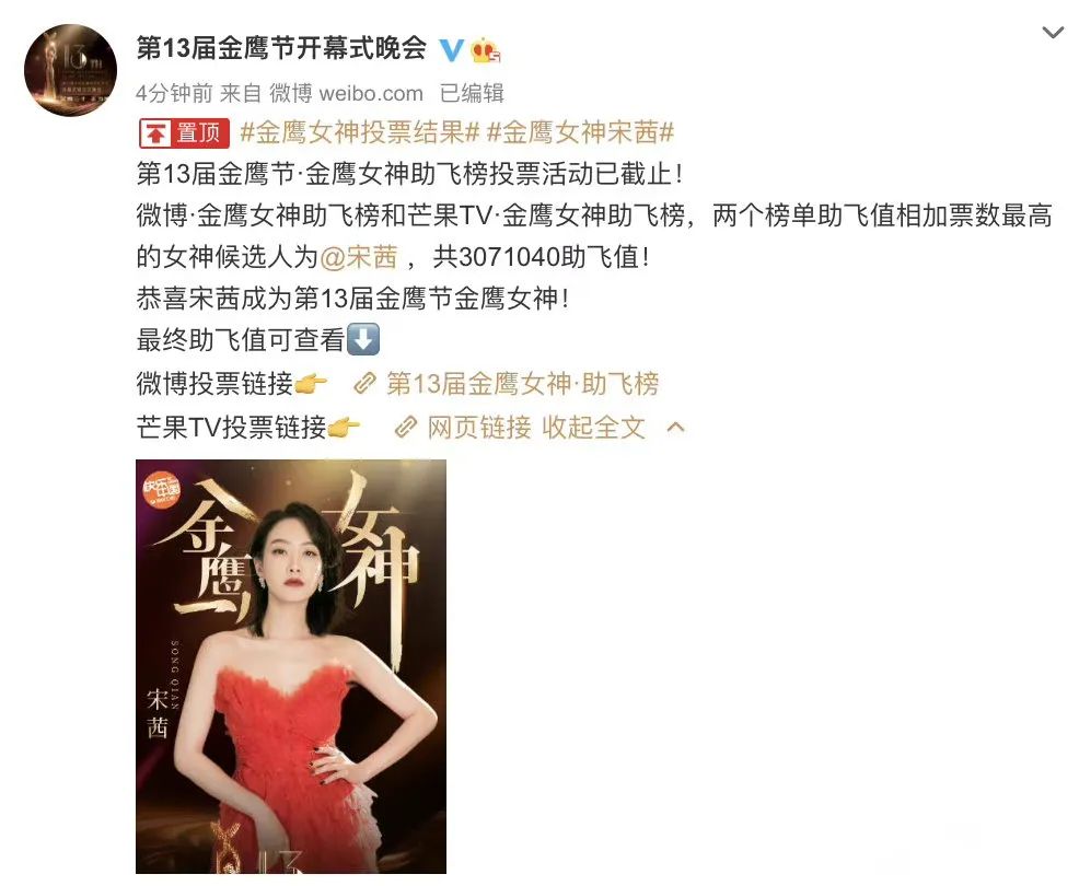接着官方宣布宋茜以两个榜相加票数最高成为第13届金鹰女神。