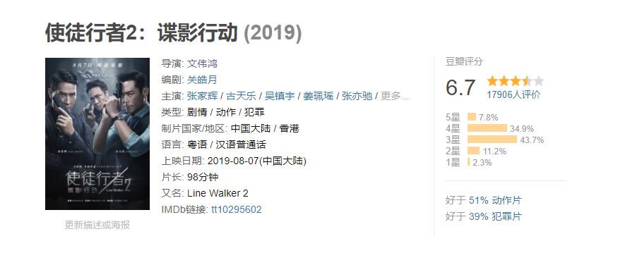 我认为这部影片,张家辉的演技仍然要强于古天乐,因为古天乐这种表演方式几十年如一日,我们也能看到他充满内疚地流泪,但是相对于一直保持镇定的古天乐来说,这种方式很难走入观众的内心,这也使得影片过于四平八稳,缺少了《速度与激情》式的血脉喷张,虽然上面也提到了枪战与追车戏的好看,但是作为类型片,观众更愿意欣赏《暗战》般的明争暗斗,从这点上来说,其实导师性质的叶志帆虽然为影片增色不少,但在推动剧情发展上却缺少建树,这也是为什么明明是三主角,最后看来看去都好像少了点什么的原因。