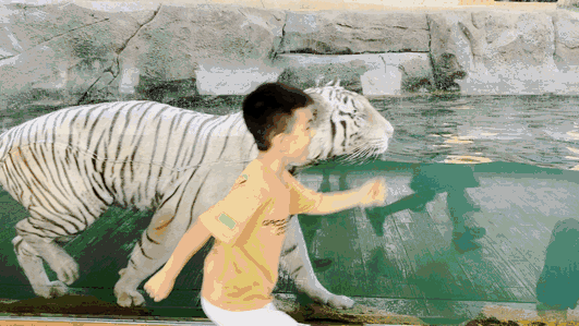 老虎神殿里有东北虎跳水,白虎观赏区人和白虎隔着一层玻璃的距离。
