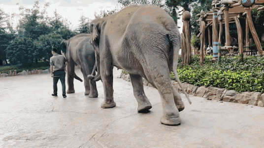 两只大象,后面一只用鼻子挽着前面一只的尾巴,悠闲地从我身边走了过去,超可爱。