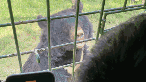 可爱的大黑熊,它们是猛兽里相对温和的,司机投食的时候,它们会乖乖的坐好,像个等待零食的孩子,如果没吃够,还喜欢扒着车走。
