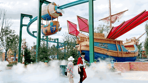 翡翠海区域值得打卡的除了上面提到的海狮剧场,目前可以玩的大型项目有海盗船和激流勇进。
