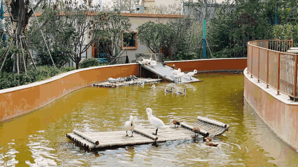 大多数人进园就开始忙着打卡游乐设施,小的观赏景点很容易被忽略。所以总有走着走着突然看到一群天鹅在河道里自由展翅的惊喜;