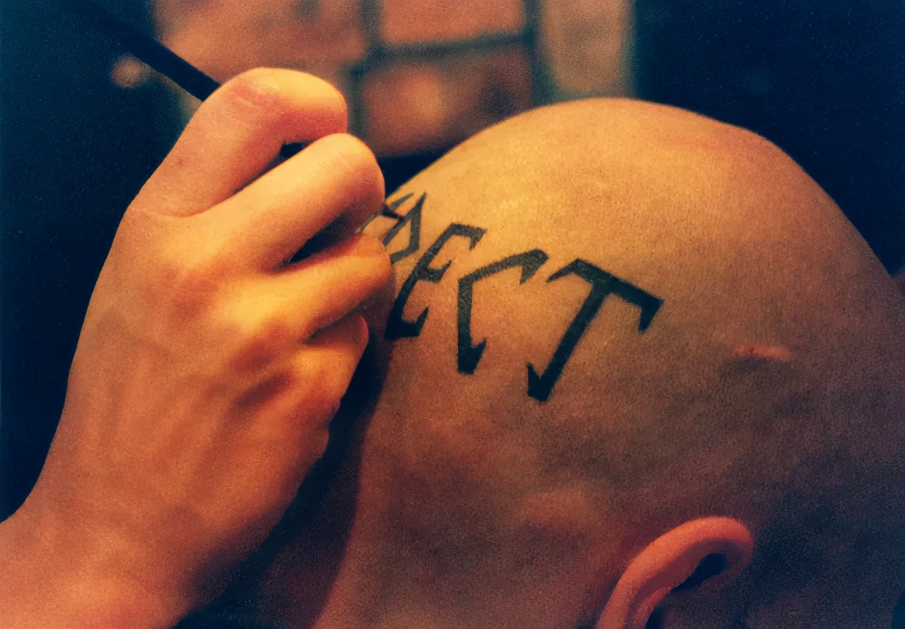 即使在这个时候,在后脑勺上用黑墨水纹着“respect”的字样,迈着大步走来走去,人们也不能不为他那温文尔雅的面貌所打动,丰满、紧抿的嘴唇和凹陷在眼眶里的哀伤的眼睛,共同削弱了这个角色的粗俗性。