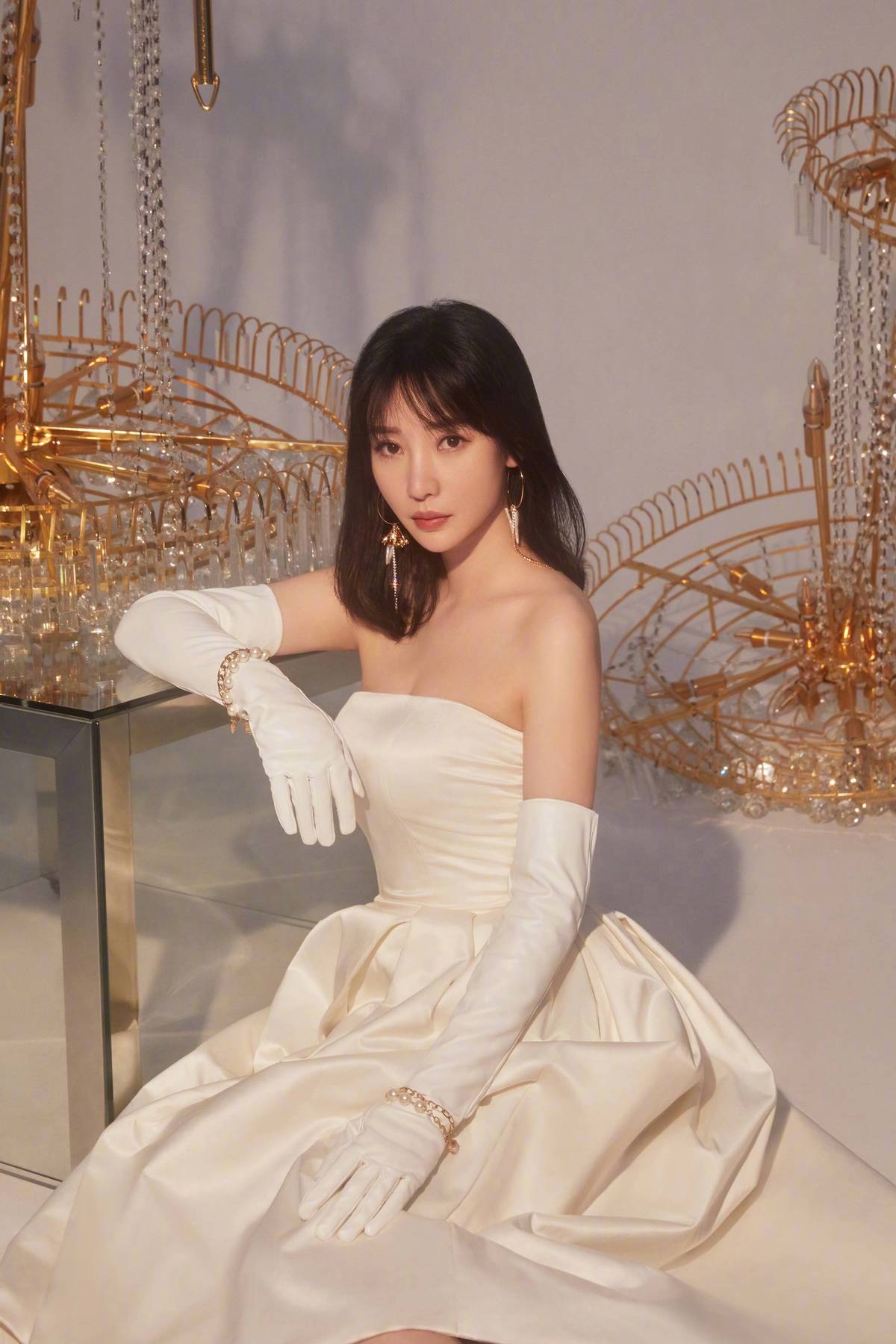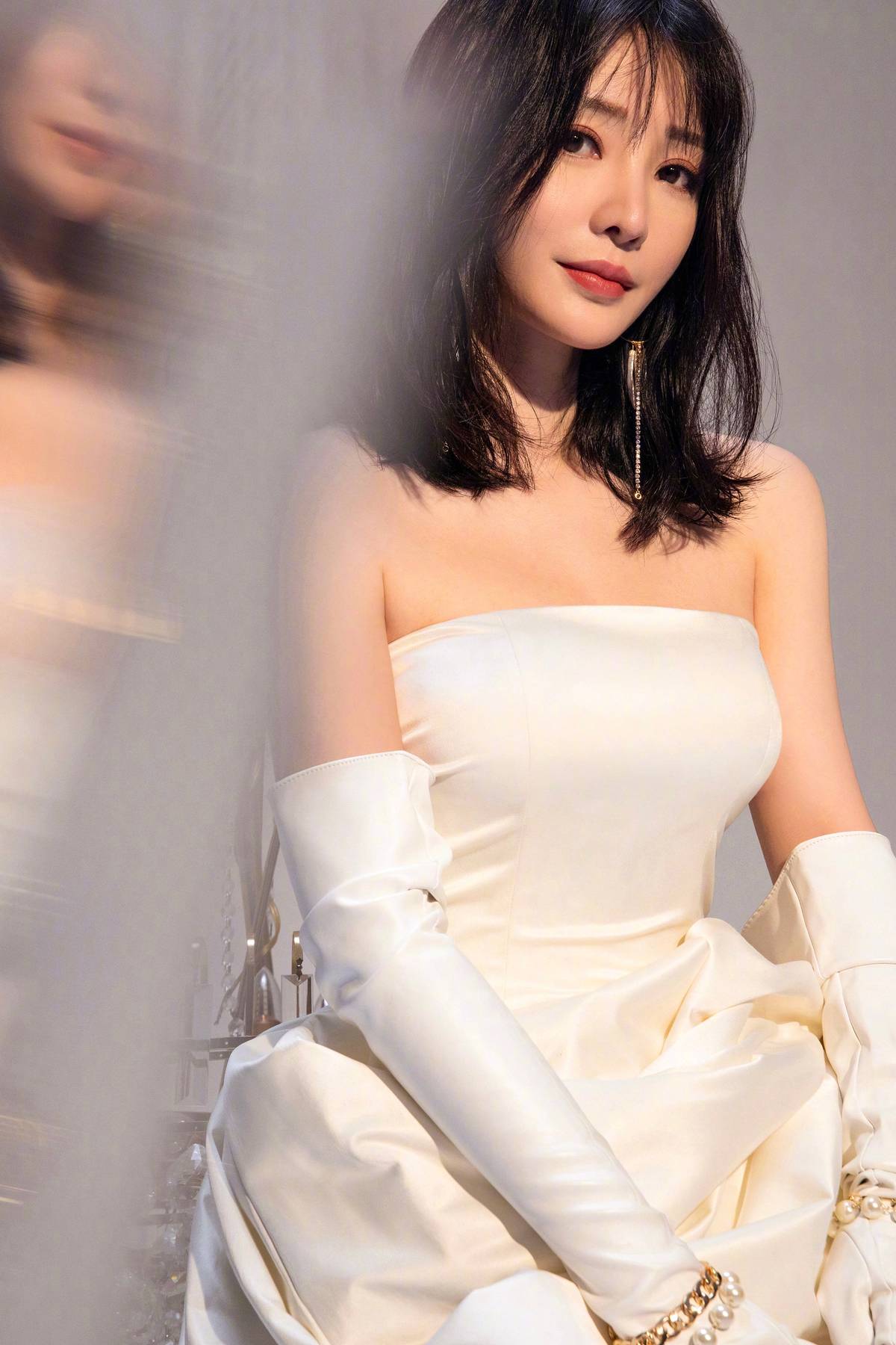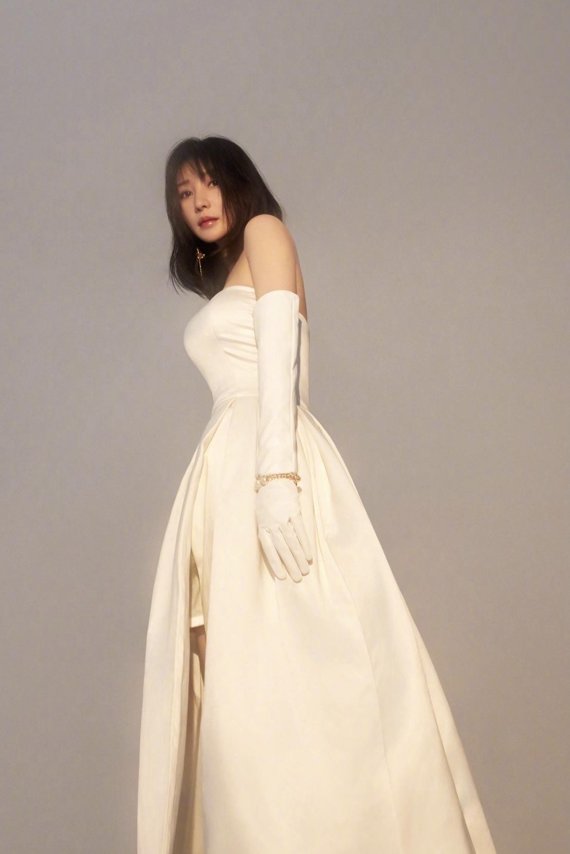 照片中,柳岩身穿抹胸白色婚纱,裙摆的设计搭配上白色缎面长手套很是独特,金色首饰更是精致感满分,虽然裙装是抹胸设计,但这并未暴露柳岩的身材缺陷,反而勾勒出其完美的肩颈曲线以及凹凸有致的身材,在镜头前她张开双臂似要跳舞,举手投足间很有气质。