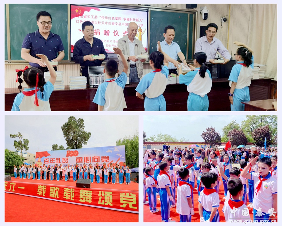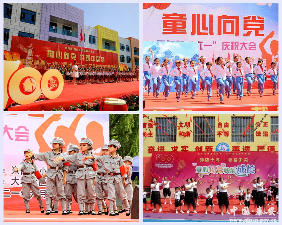 红领巾心向党。组织中小学生开展“红领巾心向党”主题班、团、队会,激励他们树立远大理想、砥砺高尚品格、增长过硬本领,争当志存高远、向上向善、善学笃行的好少年。举办少先队新队员“分批入队”仪式示范活动暨庆“六一”文艺汇演,少先队员们进行了党旗、国旗、团旗、队旗四面红色旗帜的传递,进一步增强少先队员的荣誉感和归属感,坚定少先队员们听党话,跟党走的决心,激发他们树立从小学先锋、长大做先锋的志向。秦安县第一幼儿园举办“童心向党 共筑中国梦”庆“六一”文艺汇演活动暨搬迁活动,孩子们用童心演绎快乐,用多种形式的节目传递心中的喜悦。秦安县兴国四小举办“百年礼赞 童心向党”喜迎建党100周年暨“六一”文艺演出,孩子们以真挚的感情、感人的语言、昂扬的激情赞颂英雄烈士、赞美伟大的共产党、歌颂中国共产党100年光辉历程。叶堡中心幼儿园以“学党史、树师德、严律己,勤树人”为主线,开展了丰富多彩的活动。兴丰镇中心幼儿园举办“童心向党、快乐成长”喜迎中国共产党成立100周年暨庆“六一”儿童节活动。秦安县青少年活动中心举办“红领巾心向党”小学党史知识竞赛活动。