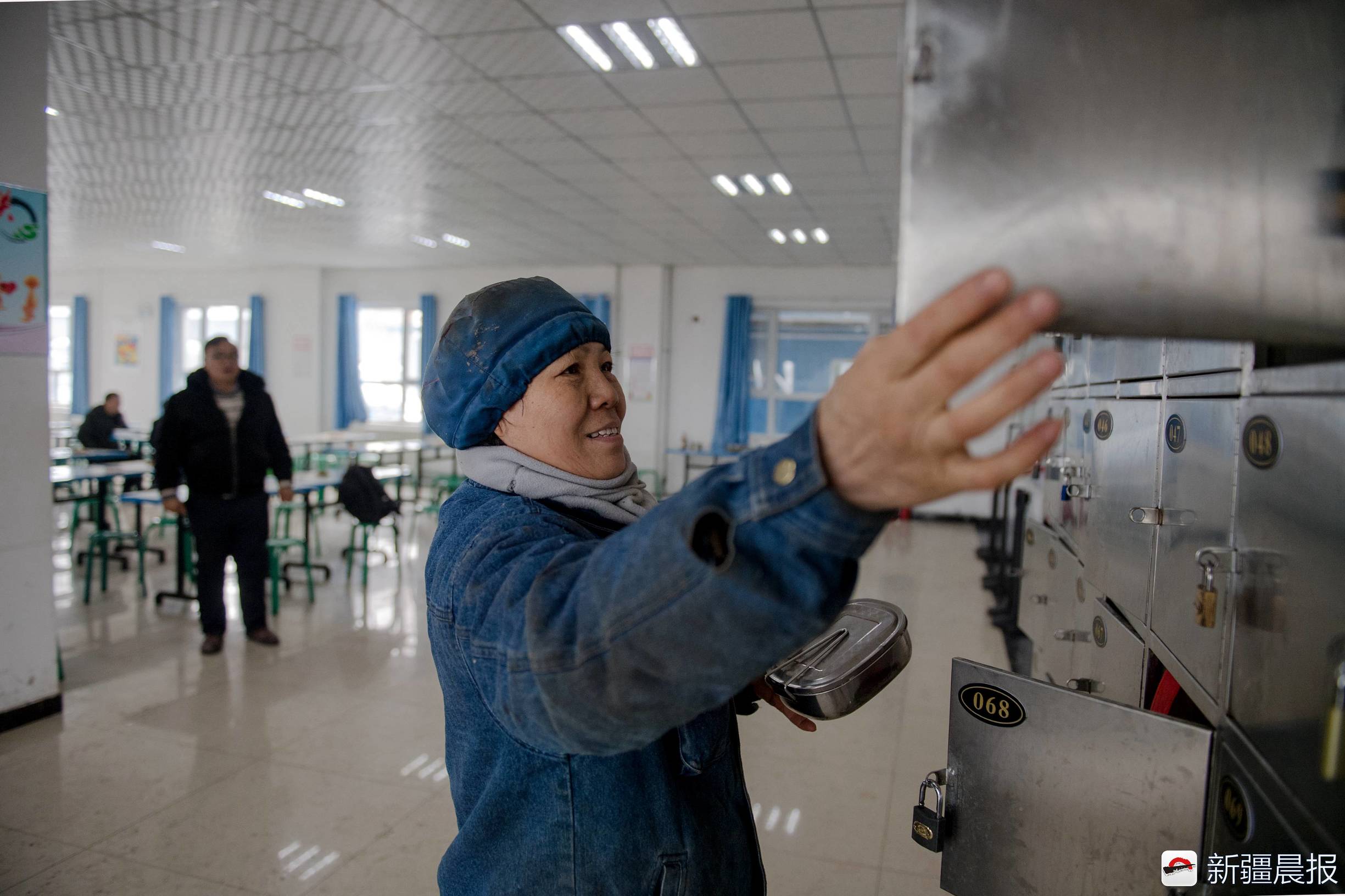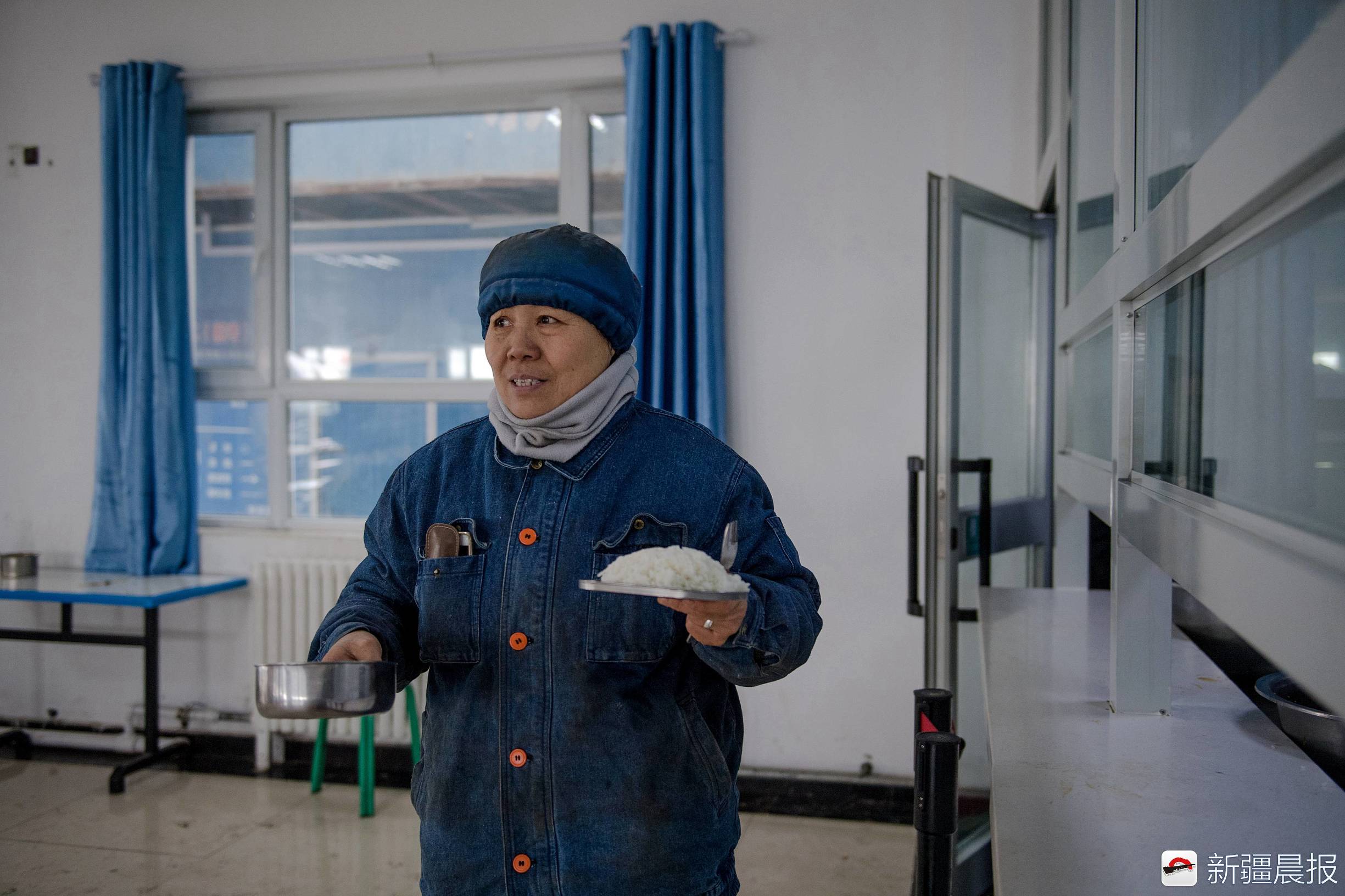 1月23日14时,乌市天山区环卫清运队食堂,李月琴拿饭盒打饭。