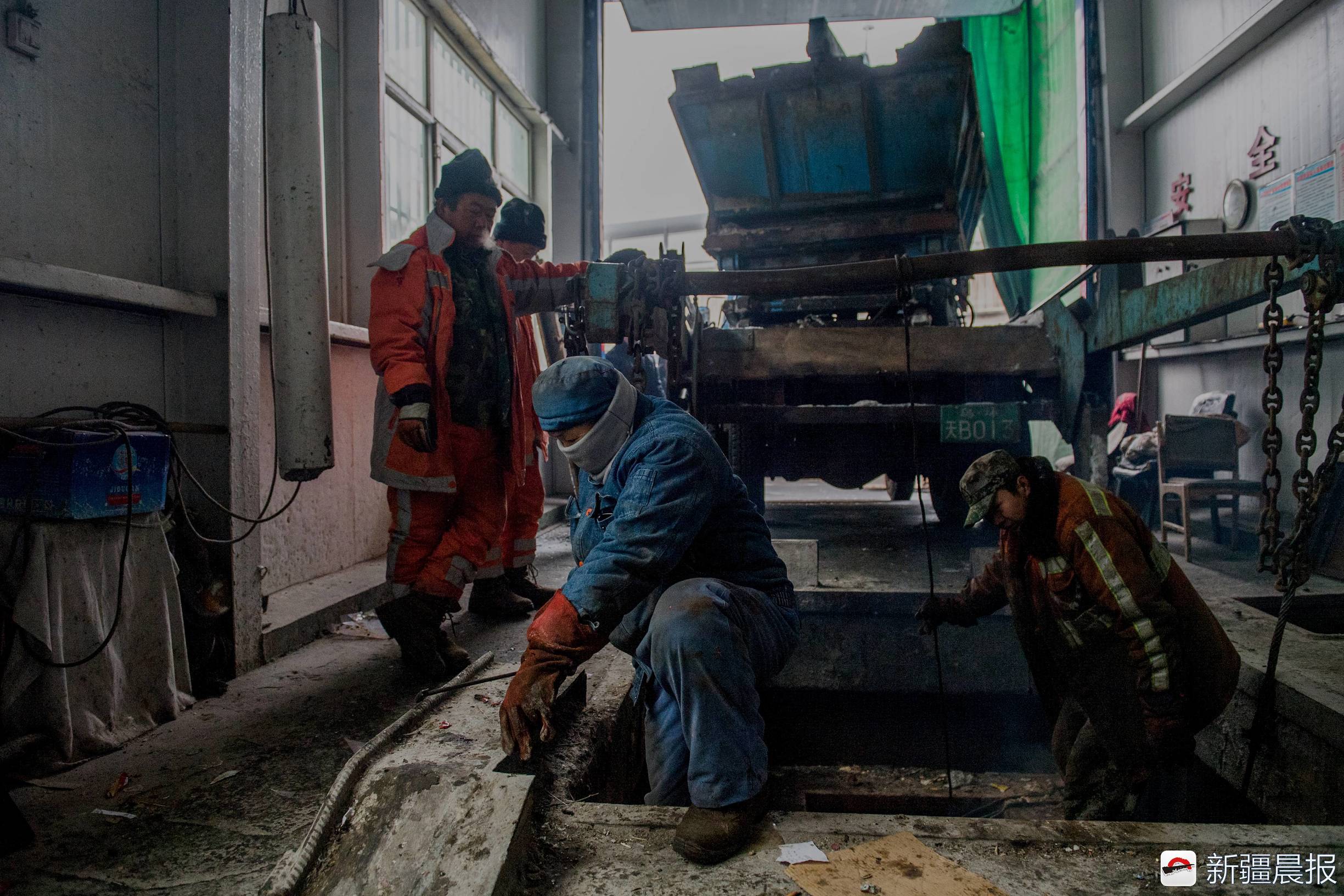 1月23日10时,乌市天山区教委路垃圾中转站,李月琴和同事要把气压垃圾翻斗处理换新。