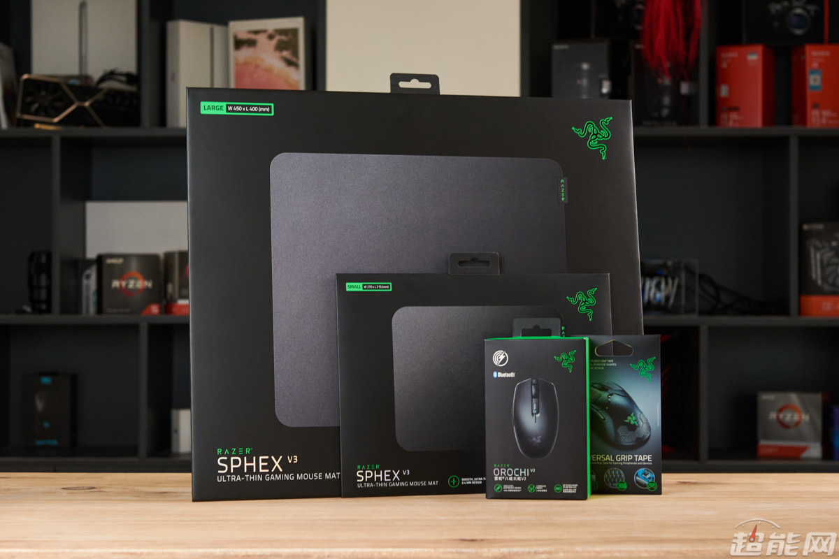 除了razer orochi 八岐大蛇 v2外,这次雷蛇还送来了最新推出的razer sphex 掘土黄蜂 v3(small/large)鼠标垫和通用防滑贴(razer universal grip tape)。