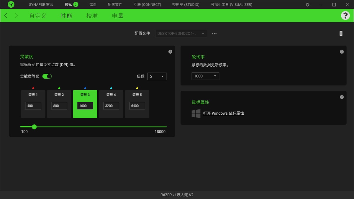 razer orochi 八岐大蛇 v2中间滑轮的后面有个小按键,点击可以切换不同的灵敏度(dpi),分别有400/800/1600/3200/6400五档。点击的时候小指示灯会有不同的颜色(代表对应的dpi)亮起,同时电脑屏幕右下角会弹出提示,告诉你切换后的dpi值是多少,用户很直观就知道自己切换后鼠标的dpi数值。用户还可以使用razer synapse 雷云 3来对razer orochi 八岐大蛇 v2进行更细致的调整,让鼠标在使用上更贴合自己的习惯,例如可以自己设置需要快速切换的灵敏度。