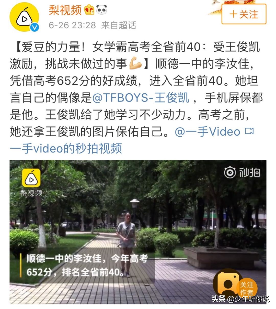 在今年高考中,这位女孩考取了652分的高分,位列全省前40名。她说她的偶像是王俊凯,正是因为王俊凯的激励,自己会努力去做很多之前从来没有尝试过的事。