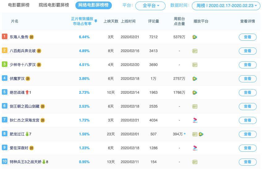 而从近一周(2月17日—2月23日)网络电影正片有效播放市场占有率来看,排在前十的也多为奇幻(《东海人鱼传》等)、动作(《少林寺十八罗汉》《伏魔罗汉》)、系列ip(《剑王朝之孤山剑藏》《狄仁杰之深海龙宫》等)。从这种程度上来说,网络电影受众的口味未见太大改变。