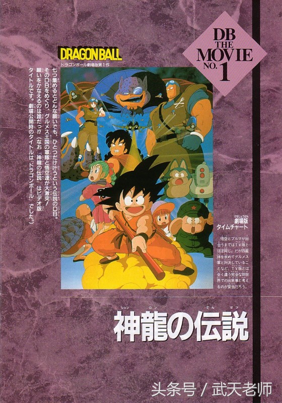 这是龙珠第一部剧场版,同时也是非常著名的一部剧场版【神龙传说】这部剧场版前半部分跟龙珠开篇剧情差不多,讲述了少女布玛和悟空寻找龙珠的冒险,后半部分则原创了一个新的帝国:咕噜曼斯王国,而我们的主角主要是跟这个国家的恶人战斗