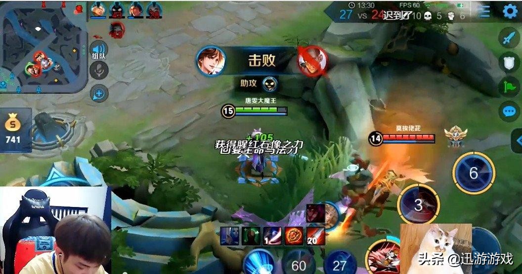 ?达摩杀完辅助后,士气大增准备一路高歌猛进借势拿下团战的胜利,所以冲锋陷阵朝着跑跑这边径直冲了过来(不知道是不是因为跑跑像极了卡顿时的状态)。跑跑正准备预见飞行撤出,想找机会再切进去,这达摩竟然自己送上门来,达摩的位置过于靠前,自家队友根本还未跟上,未免有点上头了。加上之前击杀己方辅助已经丢完大招,所以威胁程度非常低。跑跑直接一套刷过去,先拿下达摩的第一个人头。