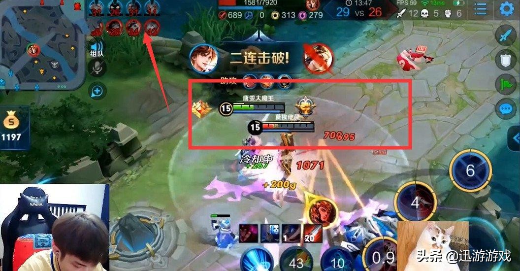 ?跑跑先是往后撤退一波,确认敌方辅助东皇没有大招后才切入,本来跑跑准备一个大招先击杀残血东皇,没想到敌方杨戬也冲了上来,击杀东皇后敌方杨戬的大招cd刚好,此时我方兵线到达,跑跑肯定不能看着杨戬血量渐渐回复再打,不然根本没机会,跑跑此时也无可奈何,因为有名刀就准备血拼一波,没想到跑跑的名刀正好发挥作用,优先击杀杨戬,成功拿下四杀。