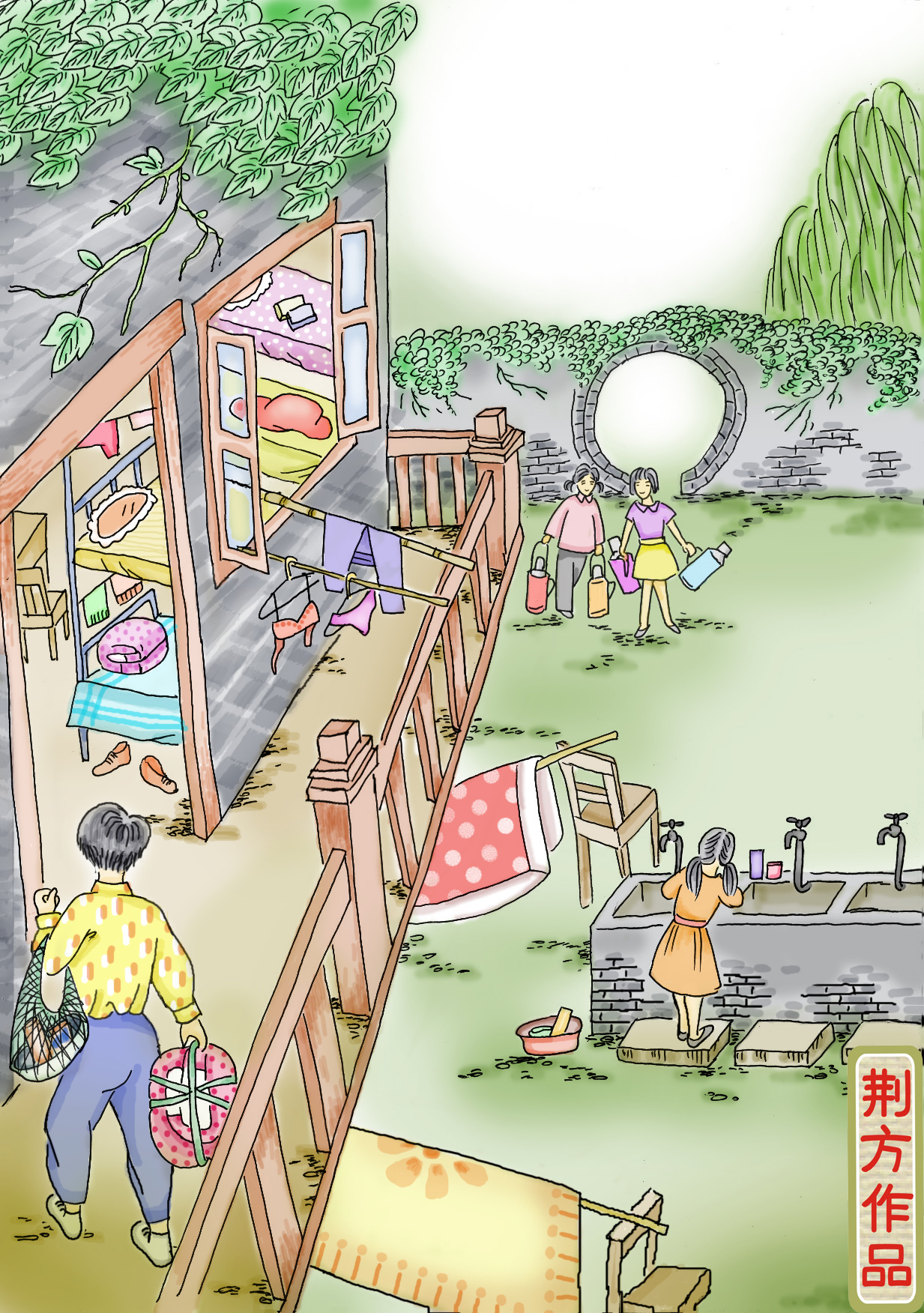 我们的宿舍楼坐落在一个青苔满地的带月亮门的小院子里,院子中央有一个水池子,是我们平时洗脸、洗衣服的地方。院子里面只有一栋两层青砖小楼,小楼很旧,木楼梯、木地板,楼体爬满了翠绿的爬墙虎。这个小楼一共只有四间房,每间都有七八十平米,我们住楼上东边那间,剩下三间是办公室和堆放杂物的库房。