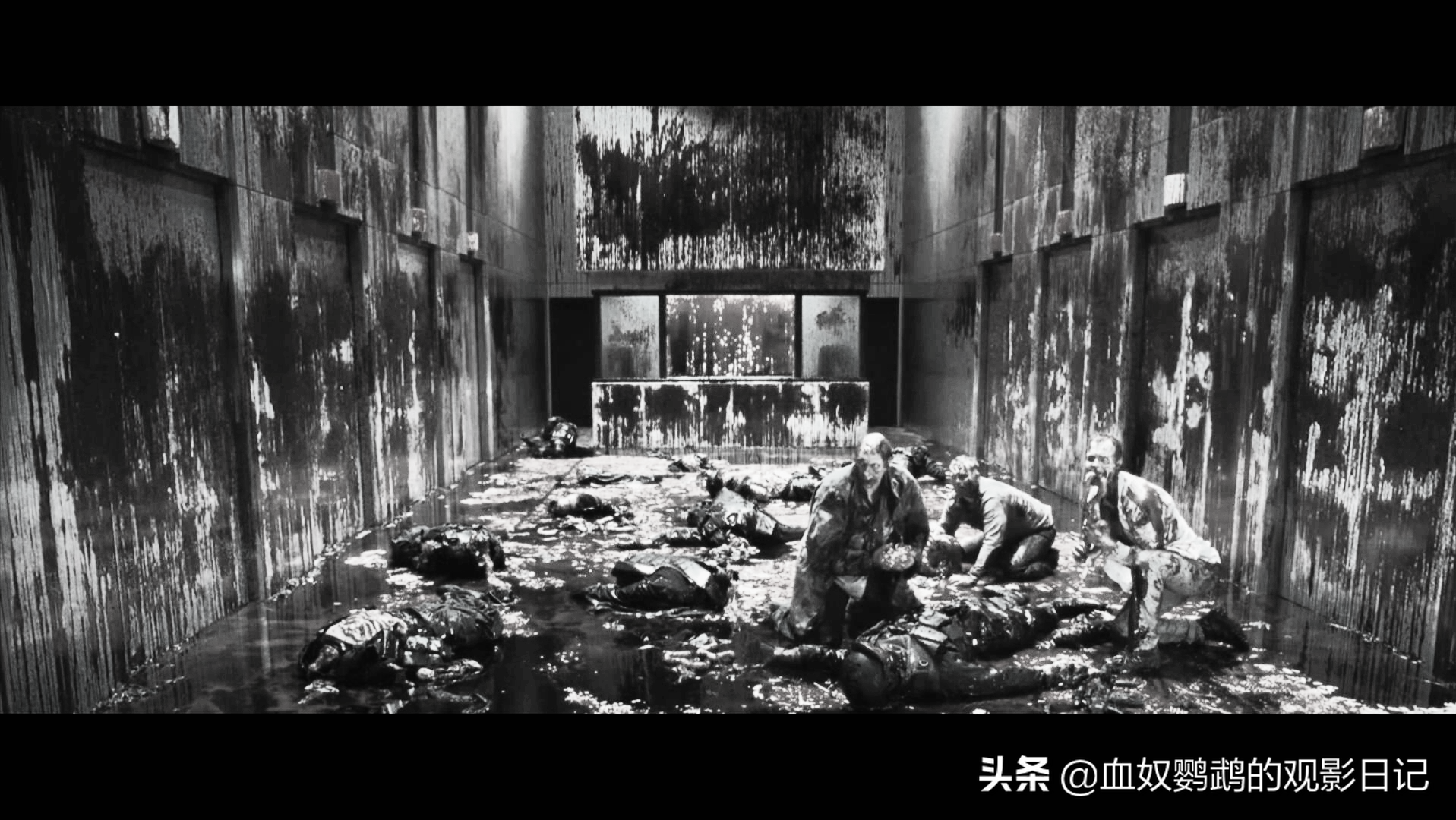 电梯门打开后,从画面左边靠中间的那部电梯中伸出树根,抓住一个倒霉士兵又缩回电梯,随即喷出一片血雾。