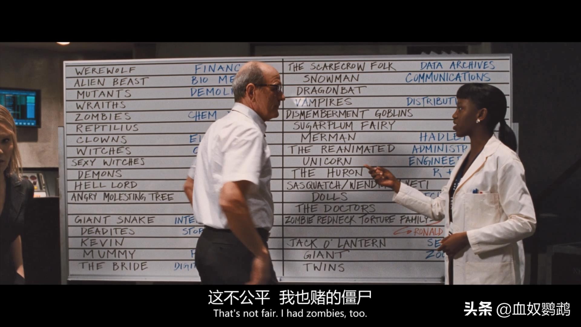 电影中那个神秘得不能再神秘的祭祀工作组成员们无聊地组织赌局时做过一张怪物表格,其中出现了34种可能被五位祭品挑中的怪物: