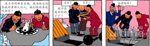 1929年,当《丁丁历险记》的第一集《丁丁在苏联》呈现在当时的读者面前时,中国人就已经出现了——故事中两个留着辫子的中国刽子手与丁丁对打了起来。两年之后,在第三集《丁丁在美洲》中,中国人的形象变得更糟了——故事中白雪担心自己成为两个中国坏蛋的盘中美餐。事实上,这两个阴险恐怖的家伙干得勾当比白雪想象得更歹毒:他们计划把五花大绑的丁丁连同重物一同沉入密执安湖(北美洲五大湖之一)。