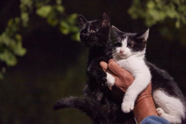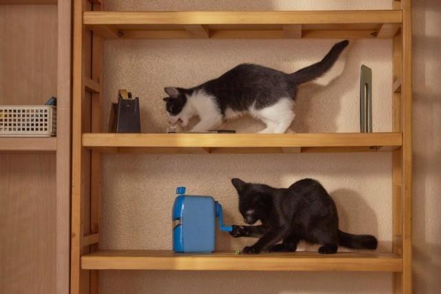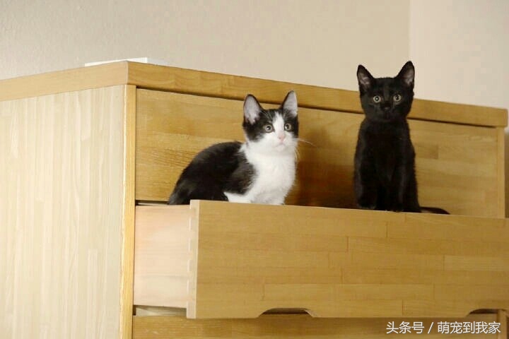从公布的照片里可以看到两只小猫一只猫色全黑,一只黑白相间。照片里有他们在书柜上、布垫上玩耍的样子,还有摄像机拍摄的情景,每张都十分可爱。