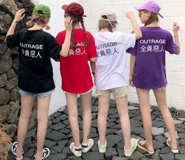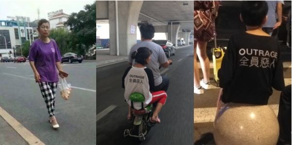 四个繁体字或是a4纸大小印在正中央,或是初号字体缩在左胸上,核心要求是中文上头要有英文翻译“outrage”,而且必须全体大写,让人晃眼一看还挺像那么回事儿。
