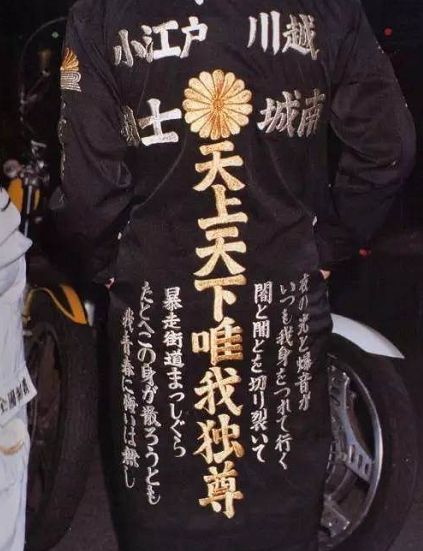 他们的特性除了骑着经过改装的摩托车,在深夜成群结队地游荡,就是在衣服上用一些生僻复杂的汉字组合来表达个性,比如最常见的“喧哗上等”、“夜露死苦”。
