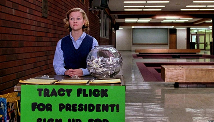 瑞茜·威瑟斯彭饰演的翠茜·弗利克(tracy flick)是一位十分能干的学生,但同时也很招人厌,做什么事都用力过猛。她的竞选口号是“选弗利克(pick flick )”,这在我看来比今年大选中任何一位候选人的口号都强。