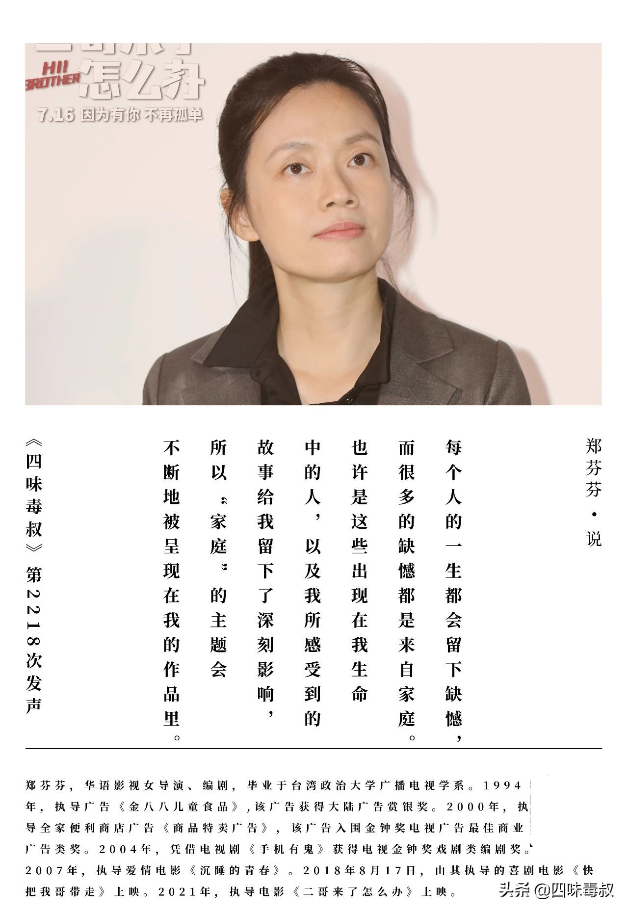 谭飞:欢迎《二哥来了怎么办》的三位主创来到《四味毒叔》。我想请大家先用一句话向影迷介绍一下这部电影。我们从著名导演,郑芬芬女士开始。