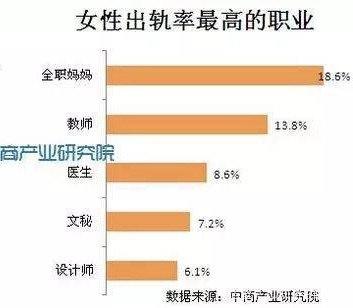 查了一下婚姻大数据,有一个数据很辣眼睛:女性出轨率最高的职业,竟然是全职妈妈!全职妈妈 18.6%的婚内出轨率占第一名,秘书只排到第四名!
